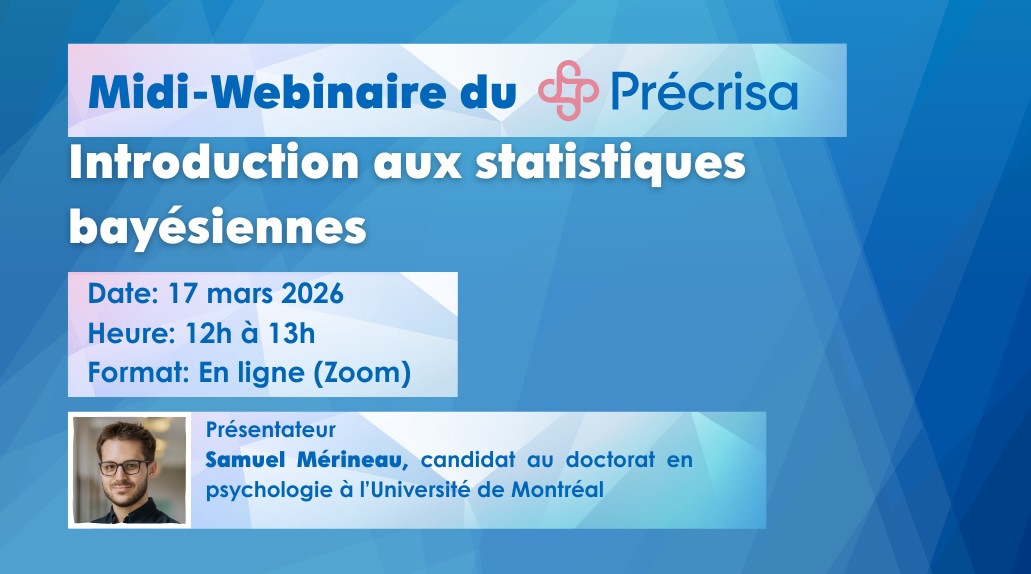 Le Précrisa vous invite à participer, le 17 mars 2026, à un webinaire présenté par Samuel Mérineau, candidat au doctorat en psychologie à l’Université de Montréal. Cette présentation offrira une introduction accessible à l’utilisation des statistiques bayésiennes.