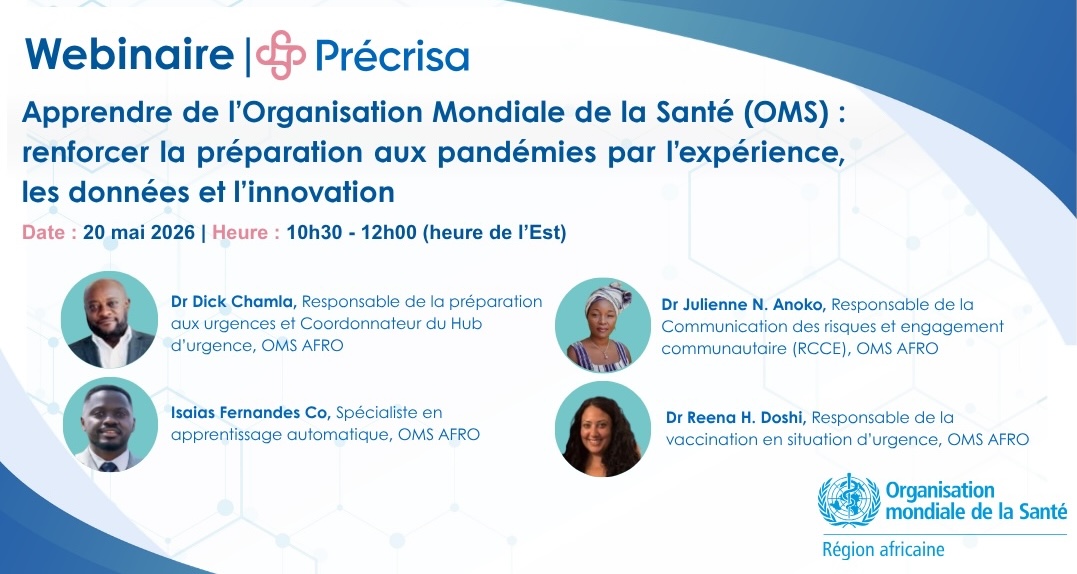 L’axe Systèmes de santé du Réseau Précrisa vous convie à un webinaire stratégique, le 20 mai 2026, consacré aux enseignements tirés de l’expérience de l’Organisation mondiale de la Santé (OMS) en matière de préparation et de réponse aux pandémies.
