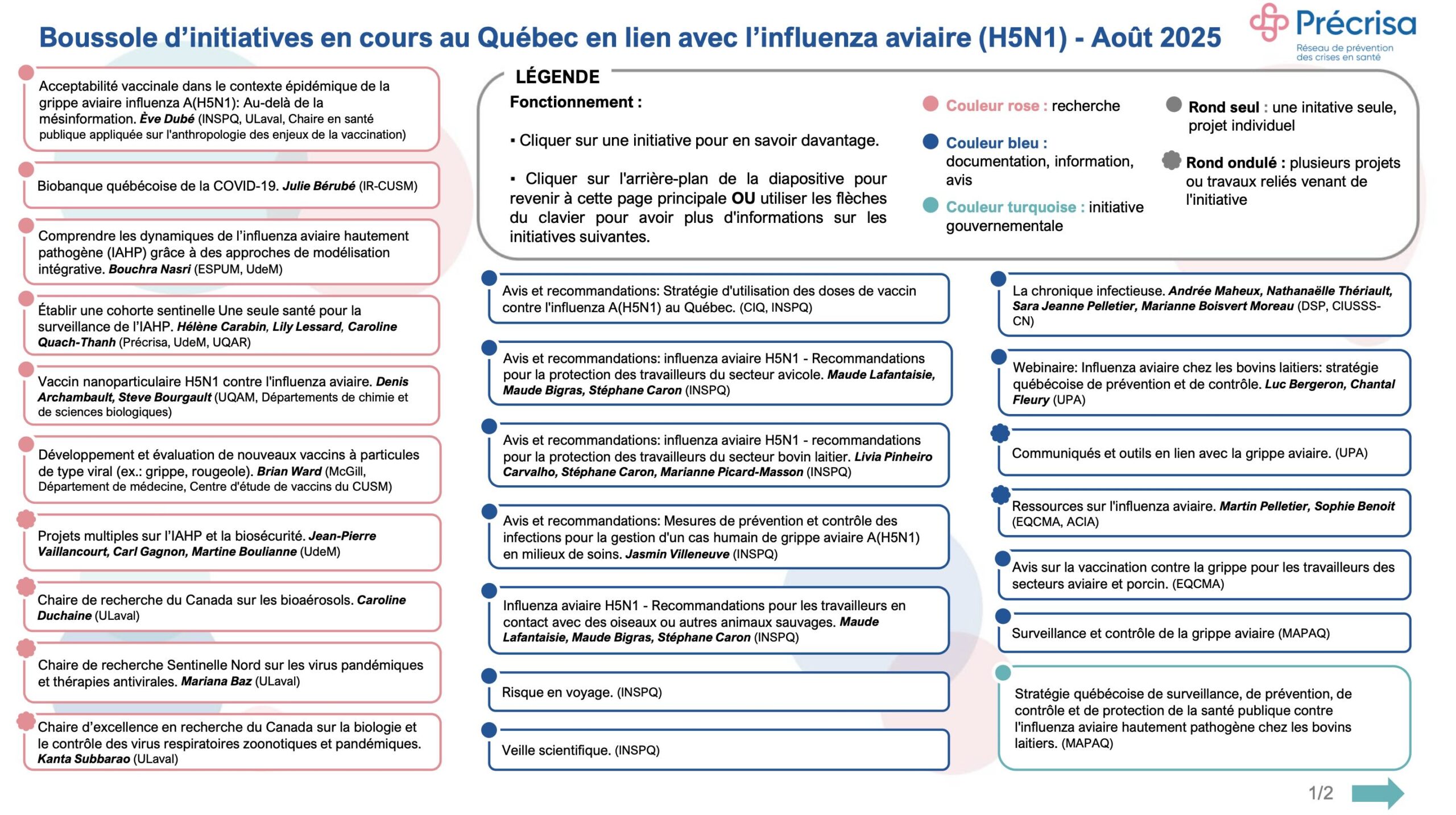La boussole interactive est un nouvel outil de cartographie évolutif des initiatives en cours au Québec en lien avec la grippe aviaire (H5N1) : projets de recherche, outils d’information, stratégies gouvernementales, webinaires, avis d’experts, etc.